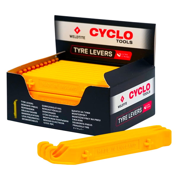 Tyre levers made in the UK and reinforced with glass nylon fibre for long lasting strength and performance. Available in bright yellow, making them easy to pick out of your pack or bag.